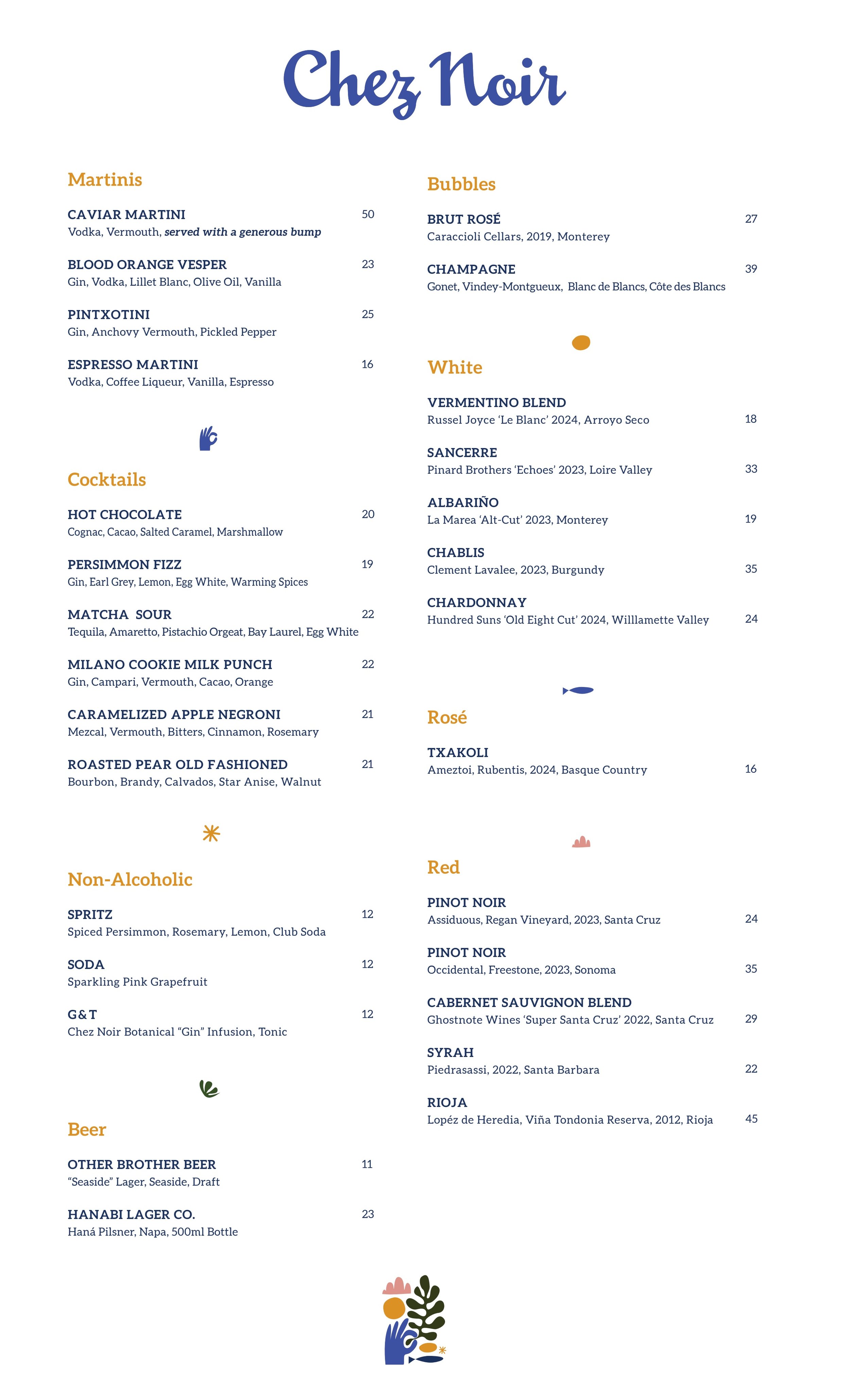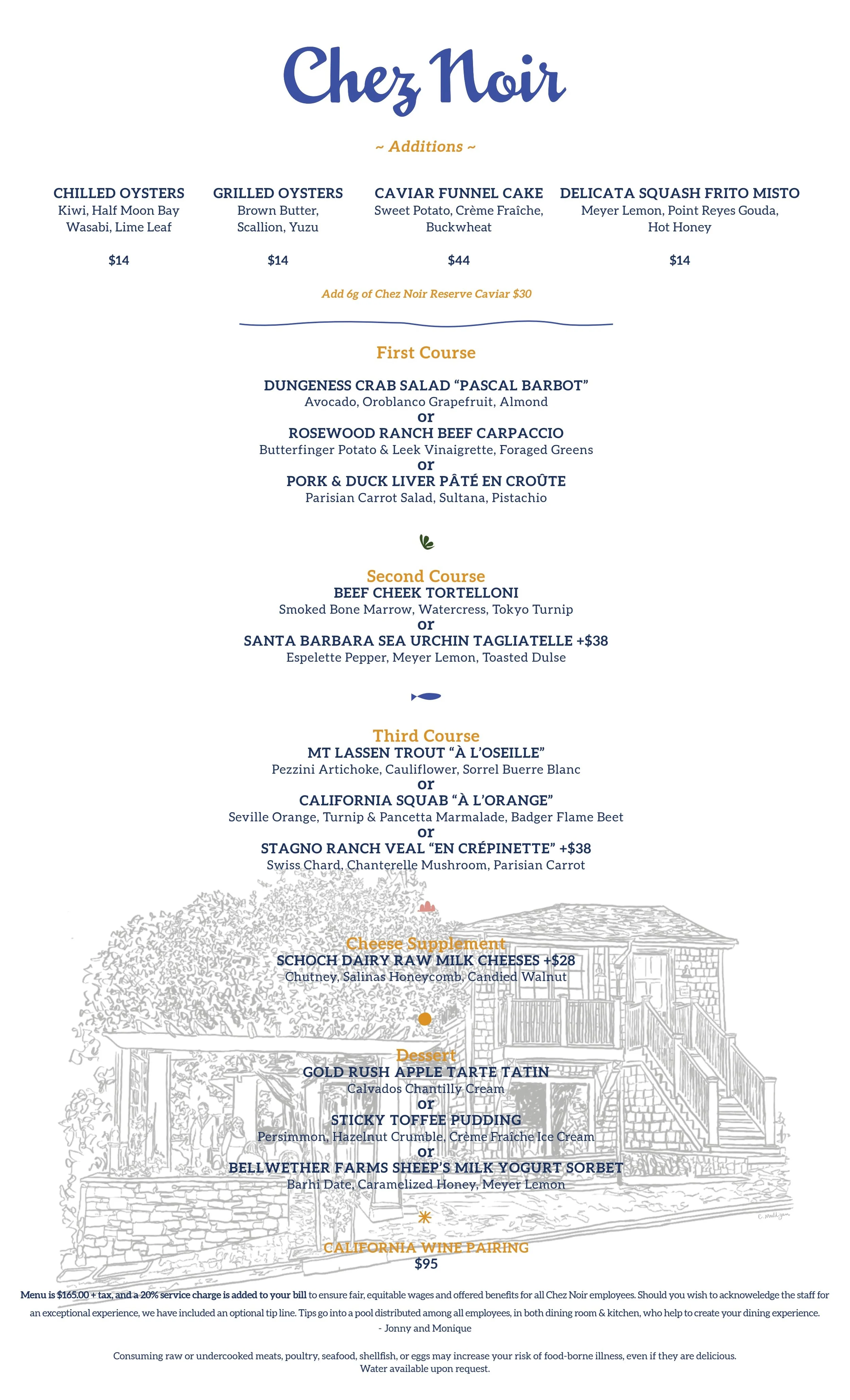 Our wine list is dynamic, and ever-changing. Please reach out to info@cheznoircarmel.com with questions about availability.
